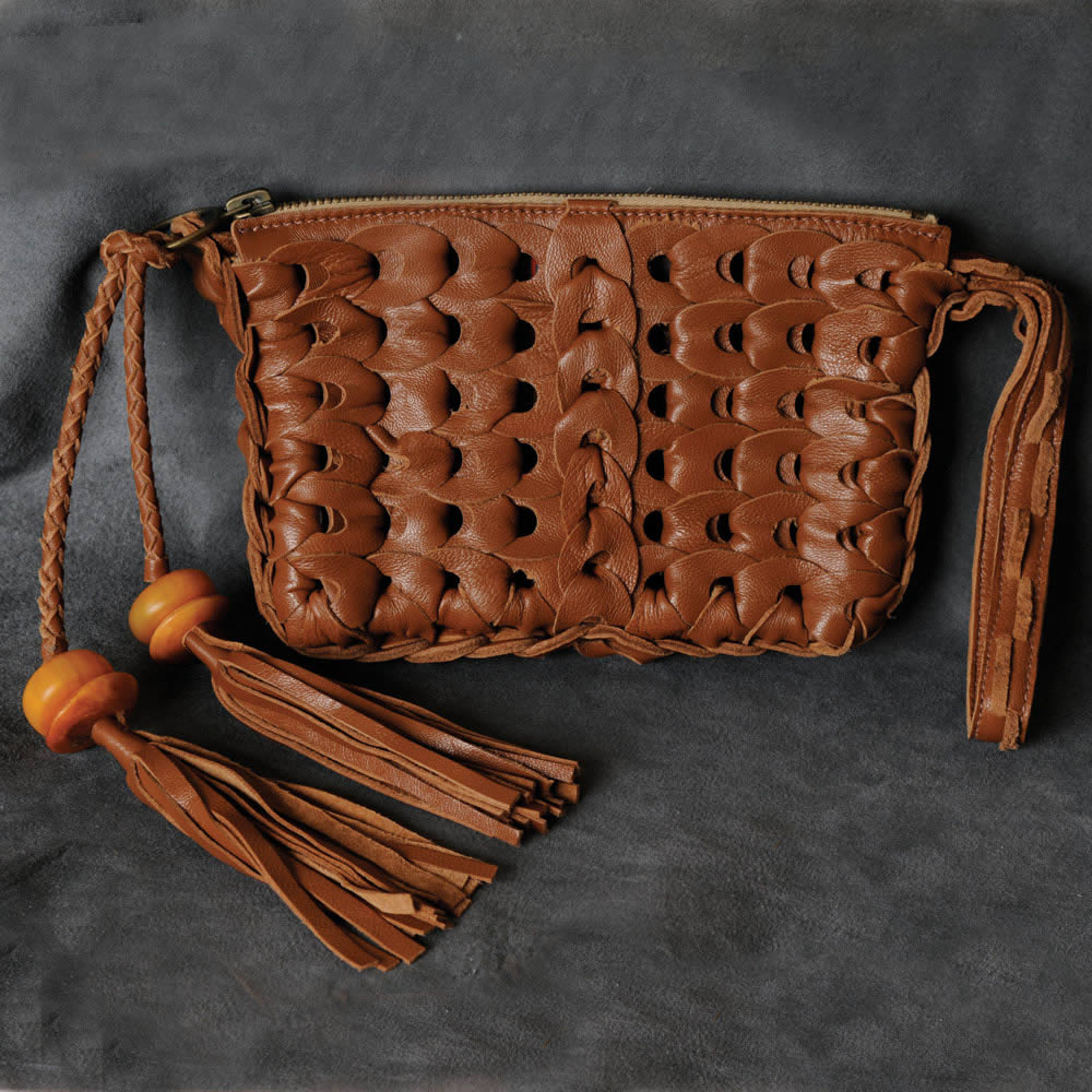 Carry this sumptuous handwoven Peruvian-inspired clutch made of the softest lambskin and accented with exotic toggle, beads and tassel.