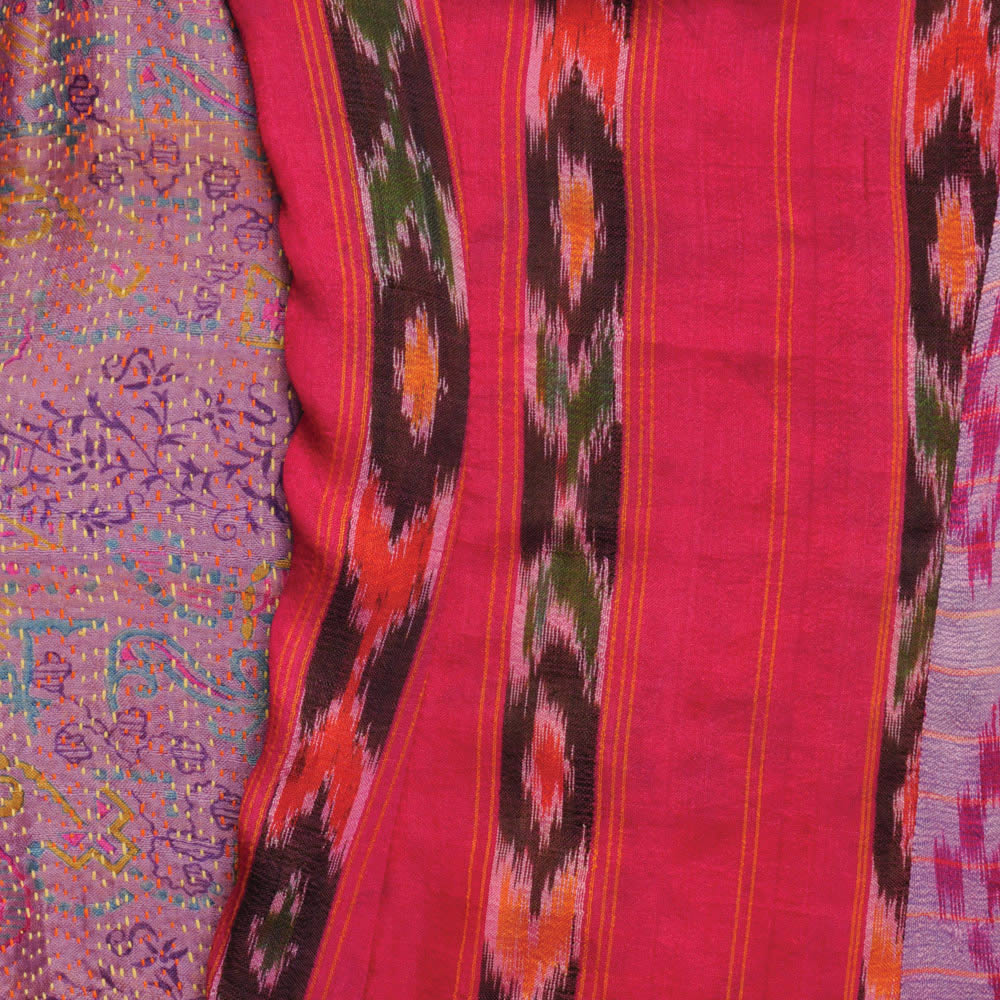 Reversible, one side with antique silk sari patchwork and other side pin tucked silk kantha textile. Wear alone or over a blouse, t-shirt or dress. Center back has reversible zipper. Boning for support.