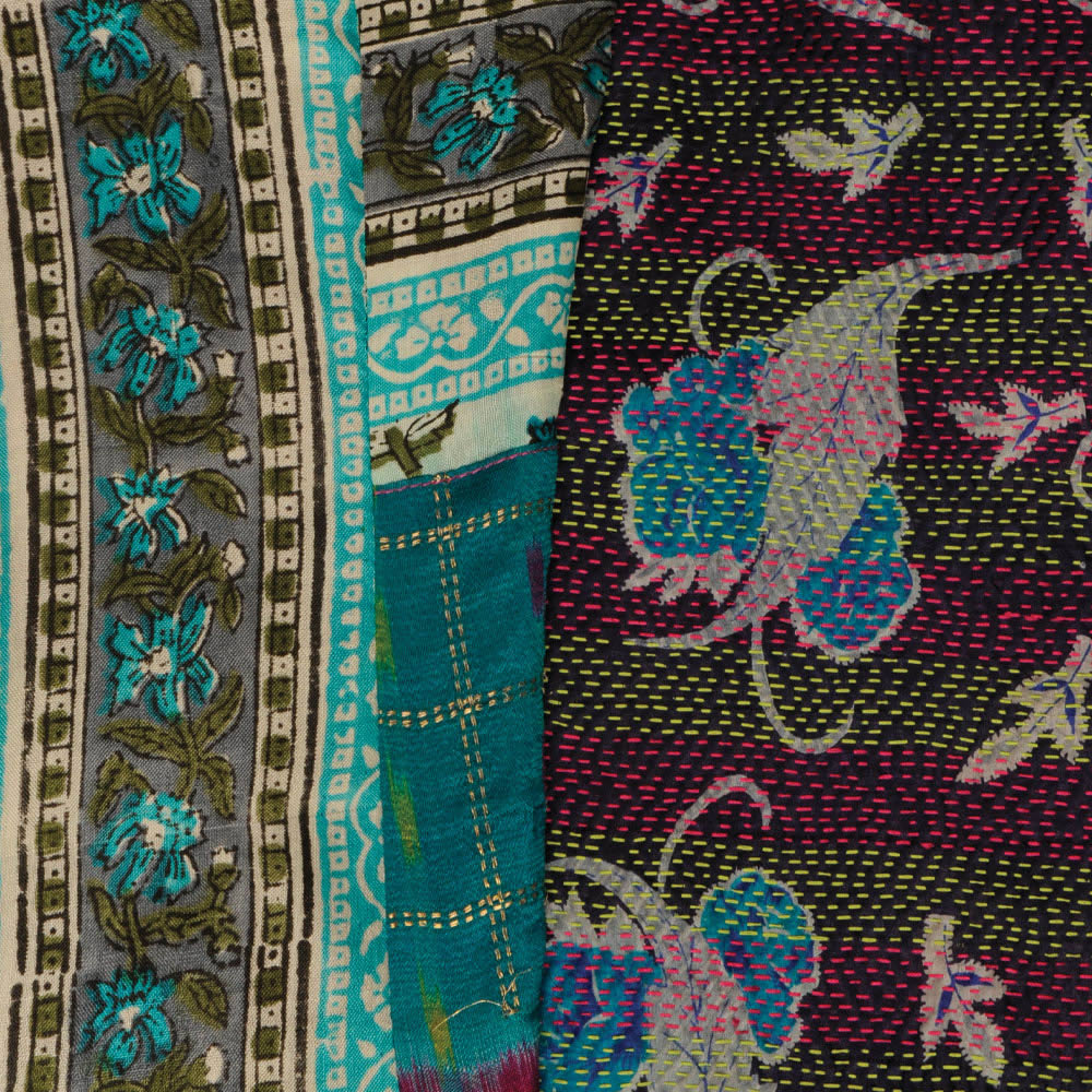 Reversible, one side with antique silk sari patchwork and other side pin tucked silk kantha textile. Wear alone or over a blouse, t-shirt or dress. Center back has reversible zipper. Boning for support.