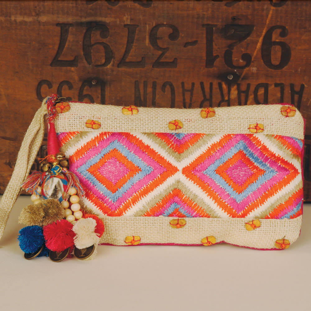 Cute zip clutch with bright embroidery, natural beads and fun pompom