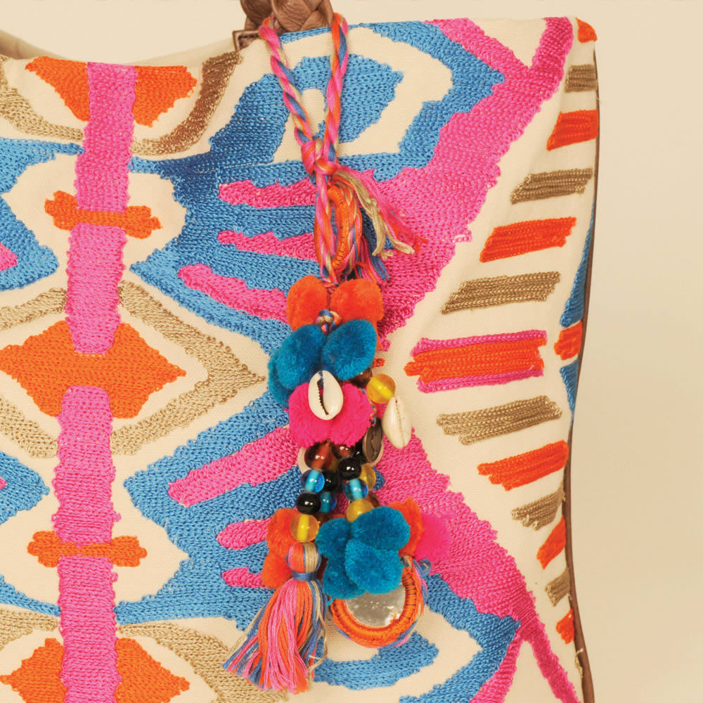 Shopper-sized tote with vibrant textured embroidery and leather braided handles