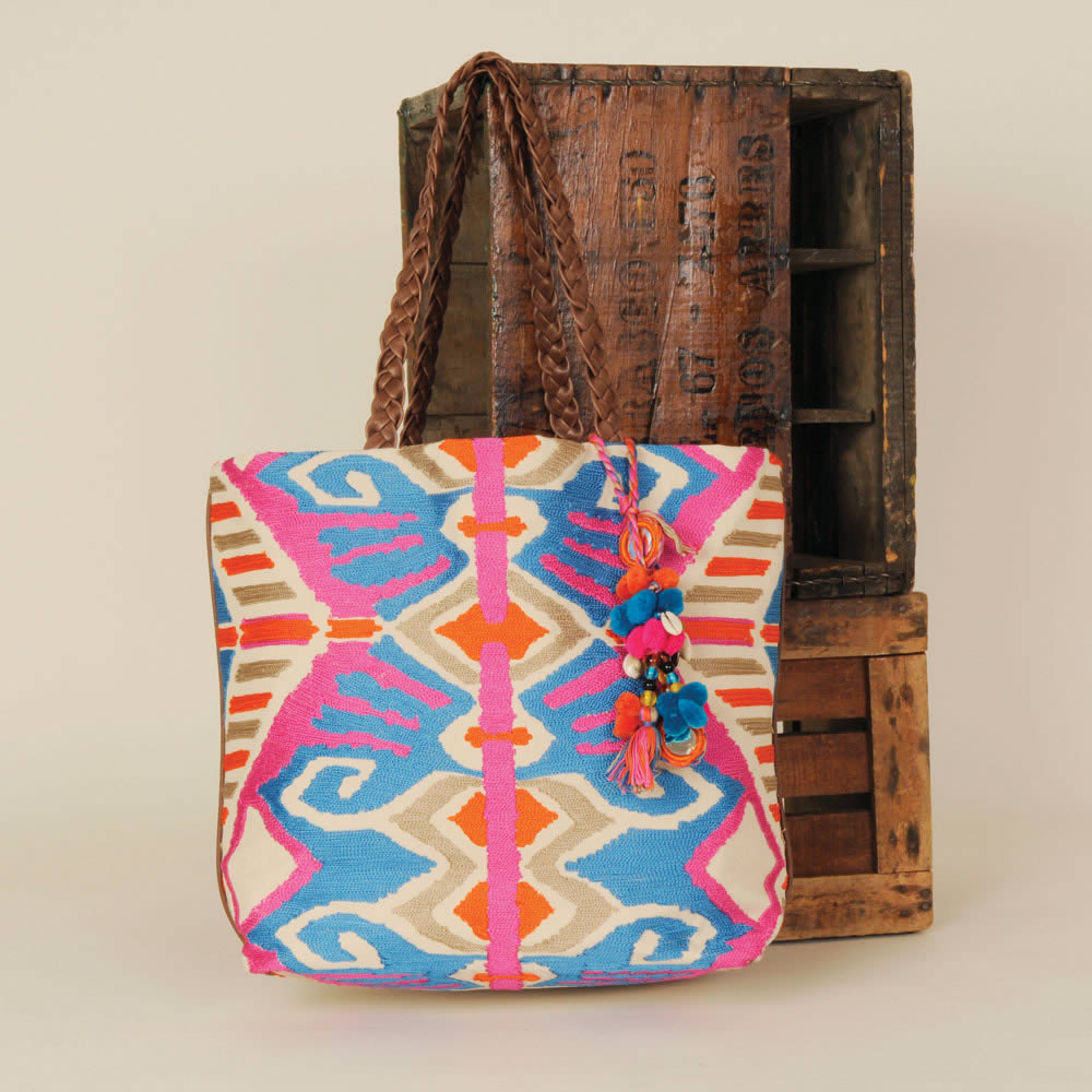 Shopper-sized tote with vibrant textured embroidery and leather braided handles