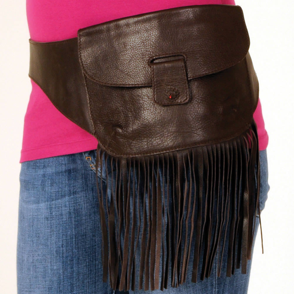 Shake those hips! Belted rich cowhide purse with sassy fringe. Antique brass double D-ring closure.