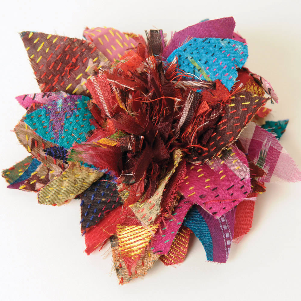 Repurposed silk saris and scarfs are used to make these vibrant and fun embellishments