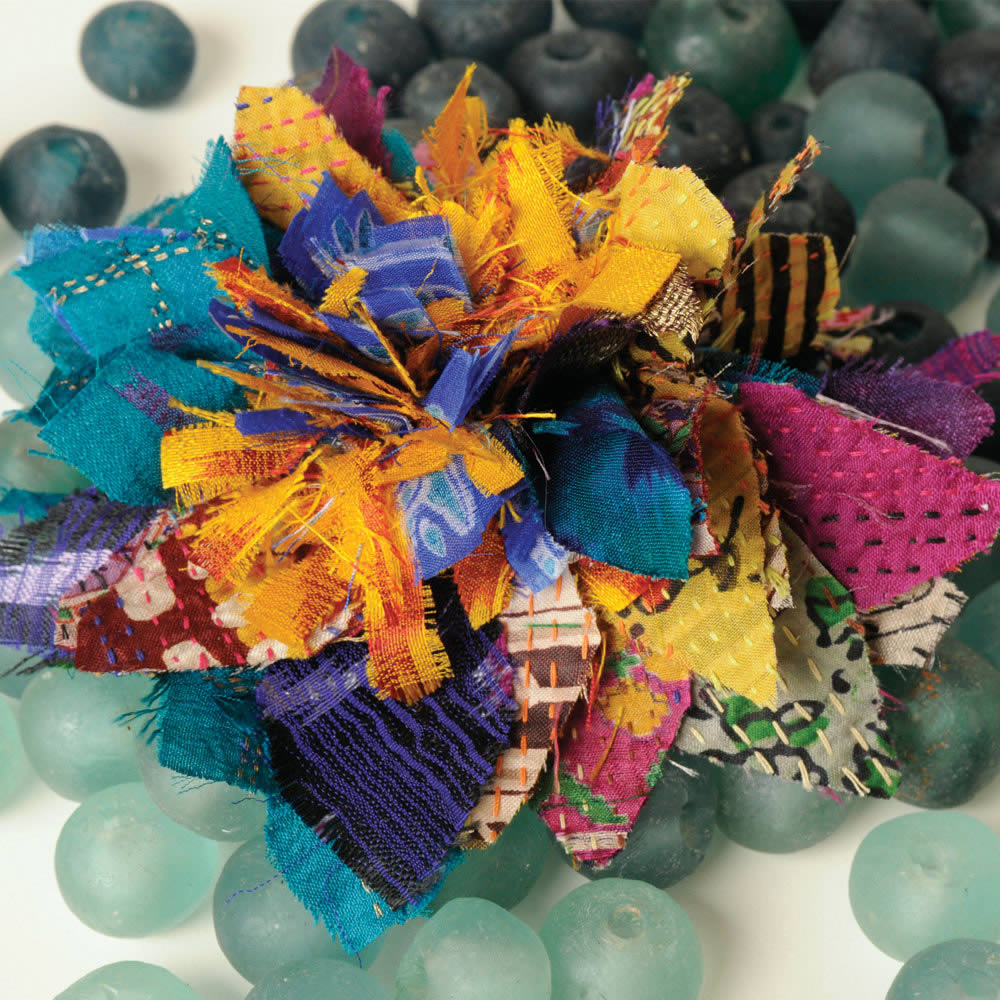 Repurposed silk saris and scarfs are used to make these vibrant and fun embellishments