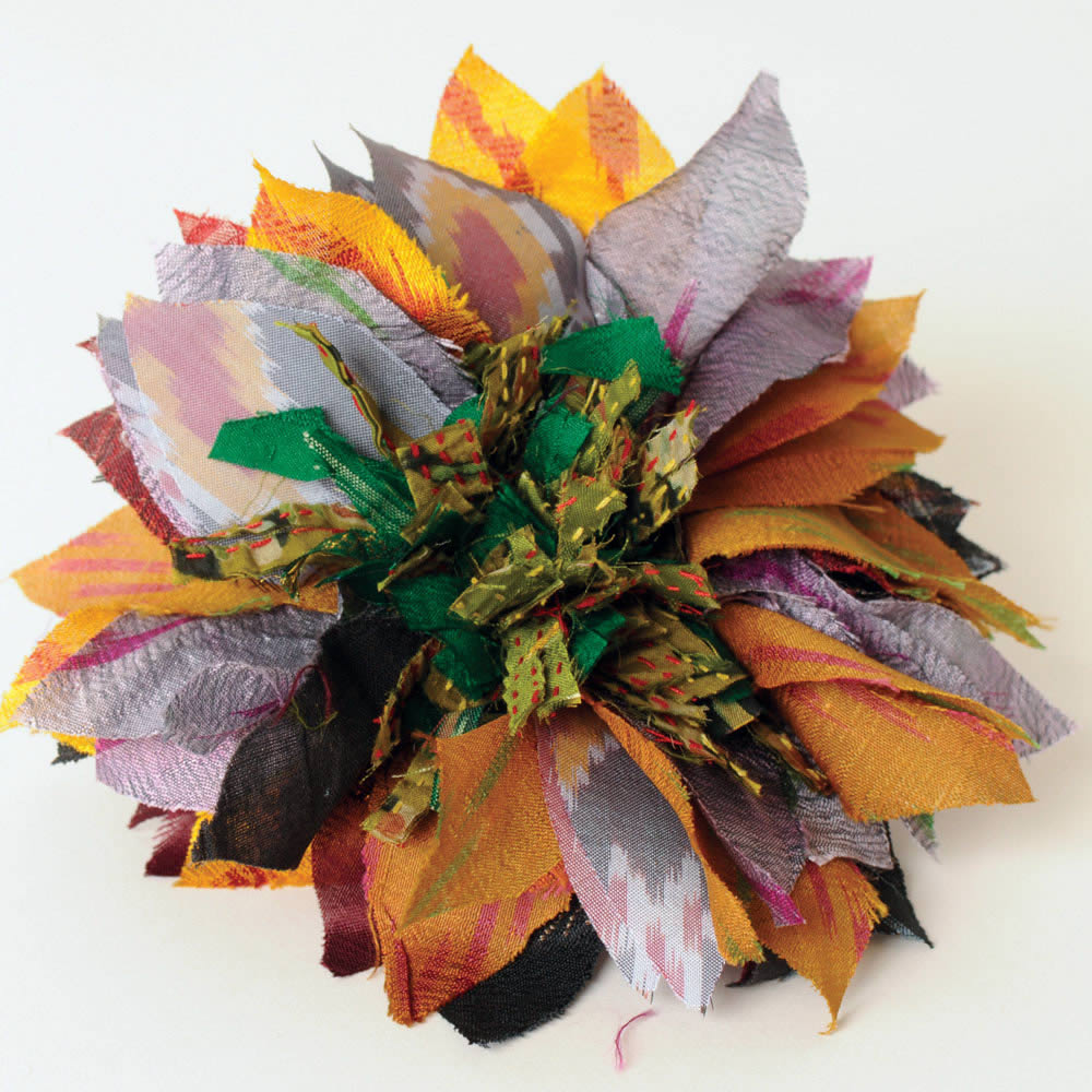 Repurposed silk saris and scarfs are used to make these vibrant and fun embellishments