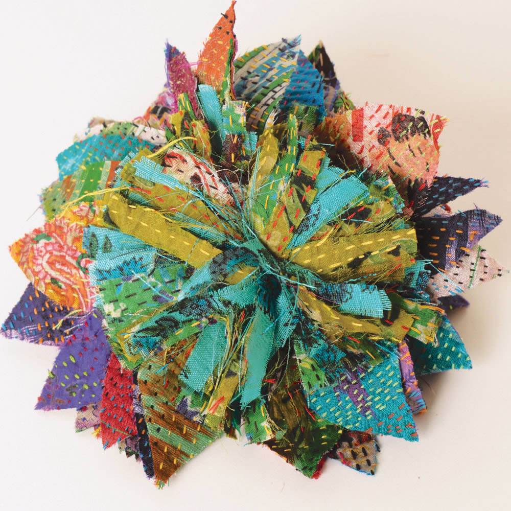 Repurposed silk saris and scarfs are used to make these vibrant and fun embellishments