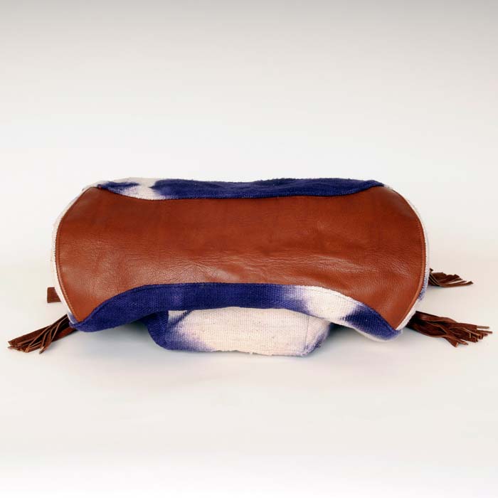 Made from colorful African Mali cloth, this bag gives off a bohemian relaxed feel. Made with yummy leather, it comes in the four options of chocolate, black, tan, and caramel leather. The Gabby Fringe Duffle is made in bright orange, blue, and purple Mali cloth making a statement with its bright urban aura. One large front flap pocket, two side zip pockets and one main compartment. Made in Los Angeles