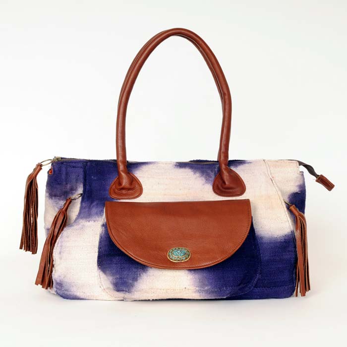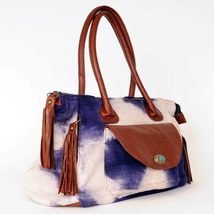 Made from colorful African Mali cloth, this bag gives off a bohemian relaxed feel. Made with yummy leather, it comes in the four options of chocolate, black, tan, and caramel leather. The Gabby Fringe Duffle is made in bright orange, blue, and purple Mali cloth making a statement with its bright urban aura. One large front flap pocket, two side zip pockets and one main compartment.  Made in Los Angeles