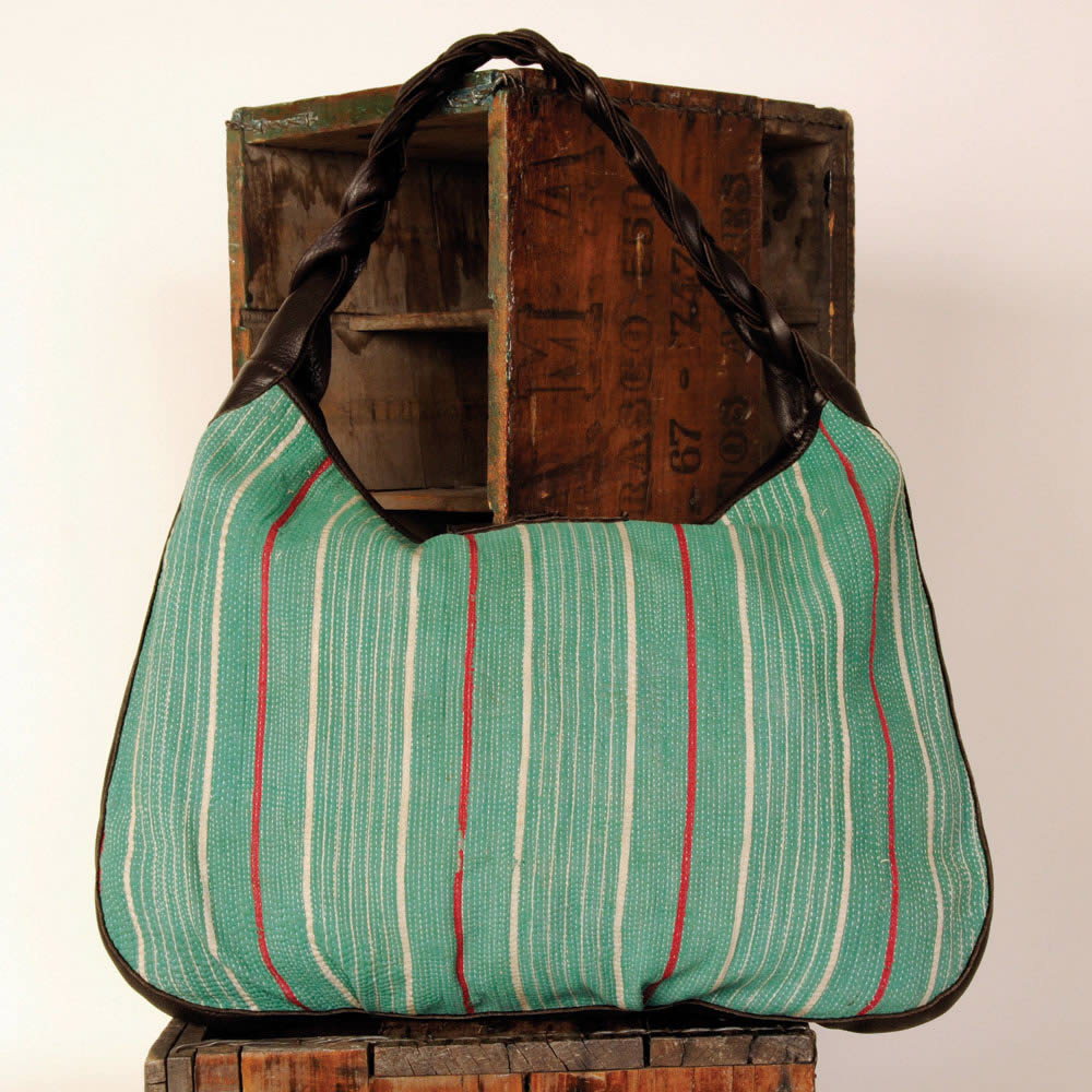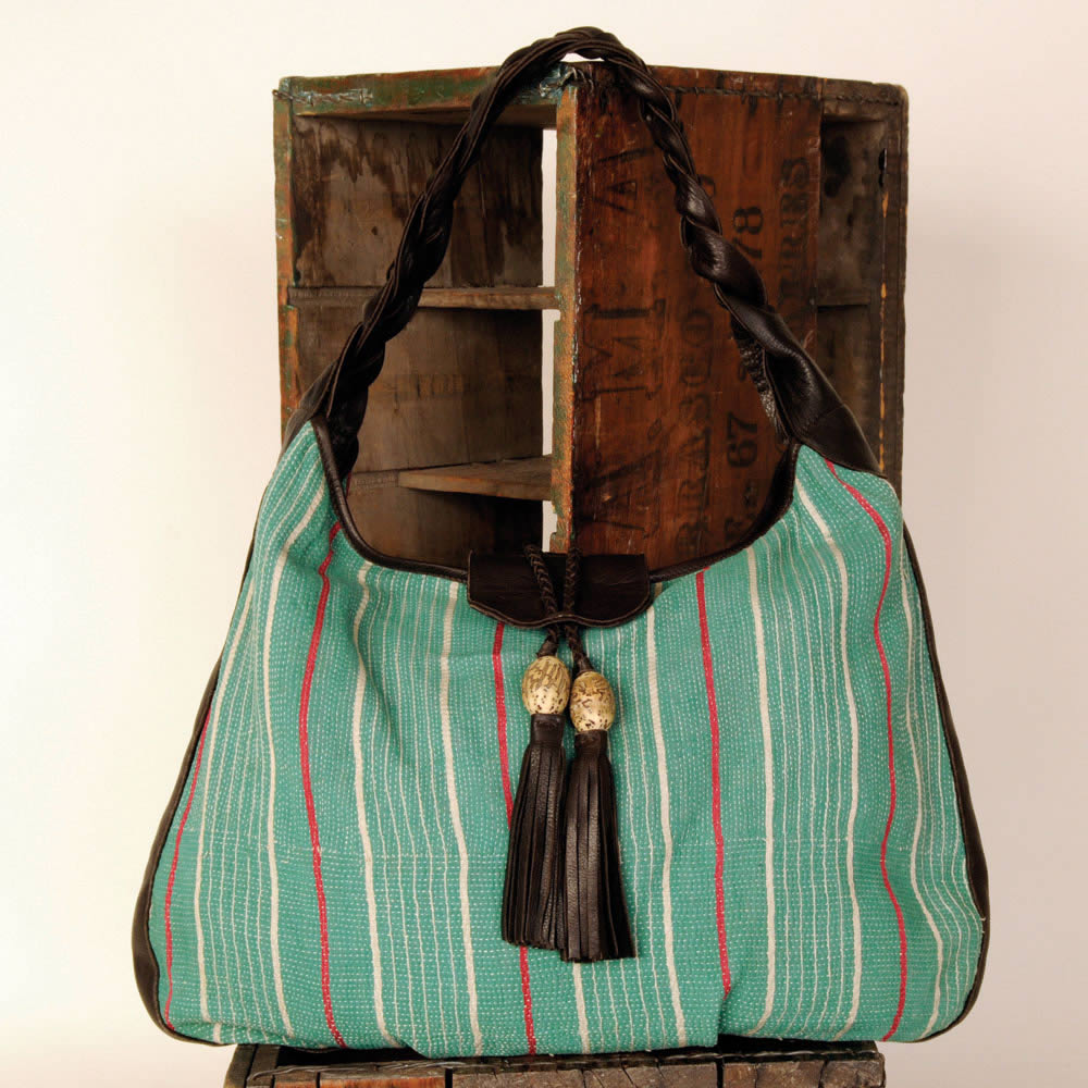 A colorful everyday bag made of imported cotton quilted kantha and braided leather strap. Leather tab closure with exotic beads and tassels.