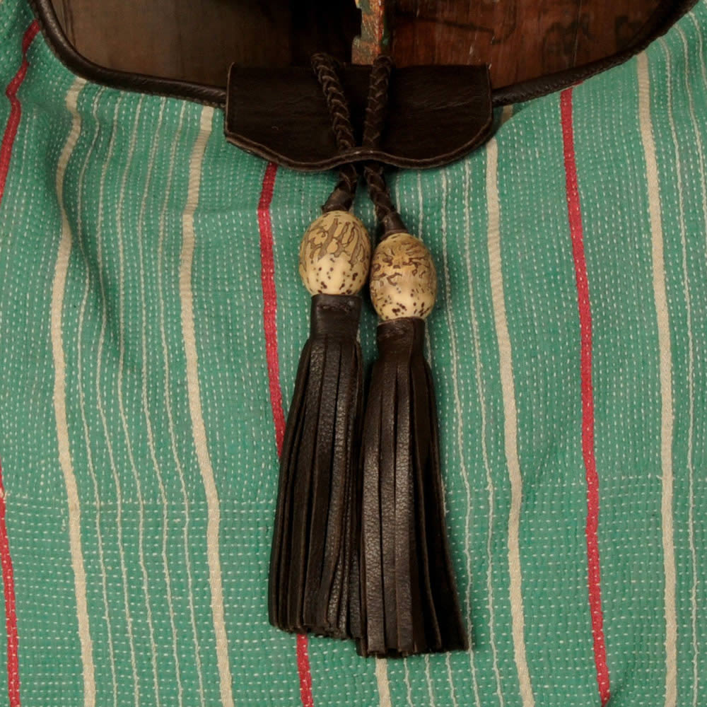 A colorful everyday bag made of imported cotton quilted kantha and braided leather strap. Leather tab closure with exotic beads and tassels.