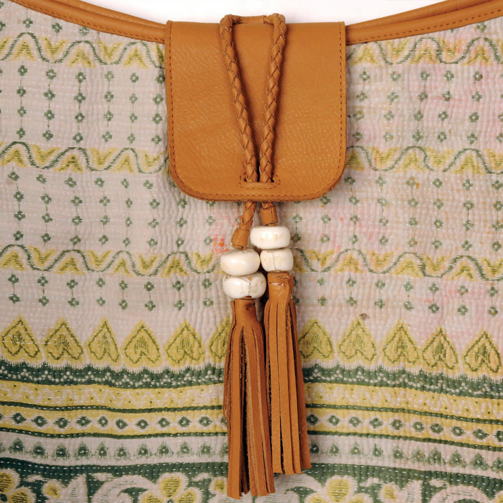 A colorful everyday bag made of imported cotton quilted kantha and braided leather strap. Leather tab closure with exotic beads and tassels.