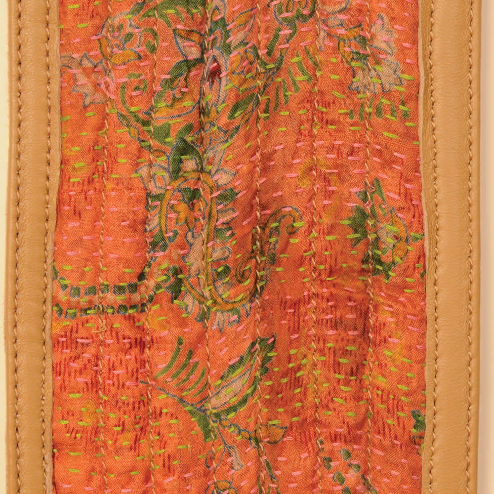 Reversible waist belt; one side leather and the other side leather framed silk kantha scarf textile