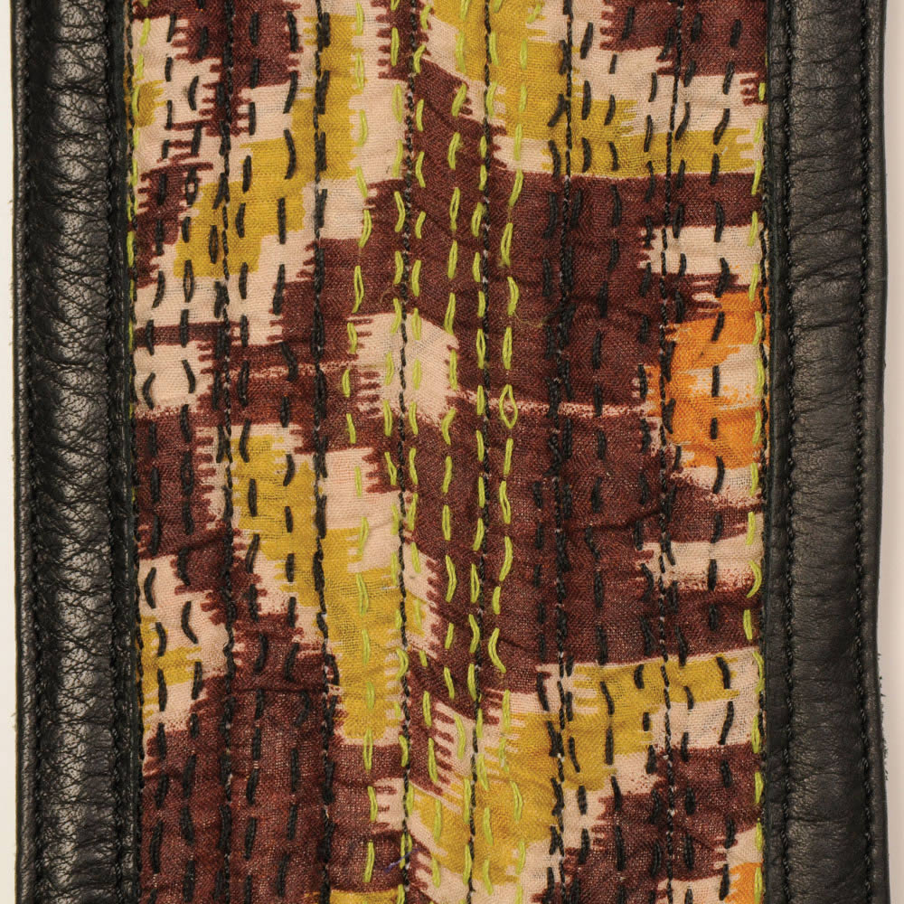 Reversible waist belt; one side leather and the other side leather framed silk kantha scarf textile
