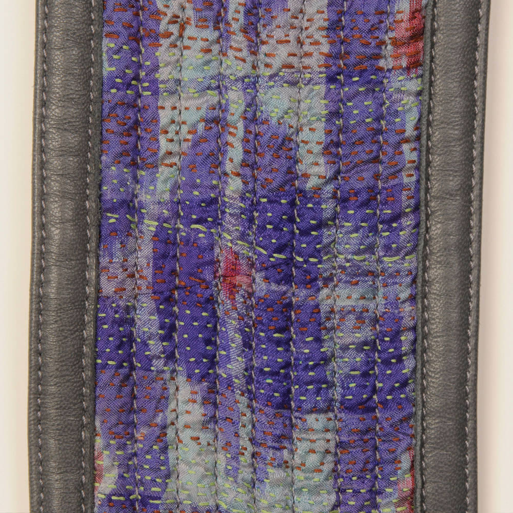 Reversible waist belt; one side leather and the other side leather framed silk kantha scarf textile