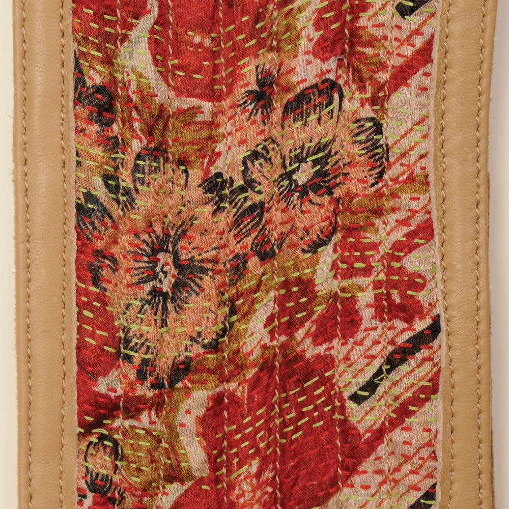 Reversible waist belt; one side leather and the other side leather framed silk kantha scarf textile