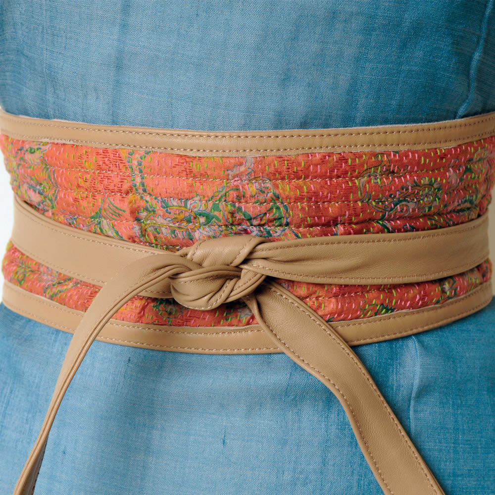 Reversible waist belt; one side leather and the other side leather framed silk kantha scarf textile