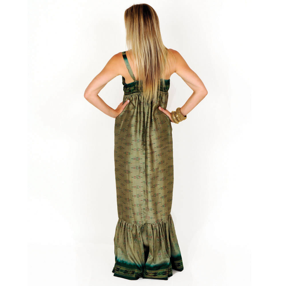 Dramatic bohemian maxi using one-of-a-kind antique silk sari. Beautiful on the beach or at dinner.
