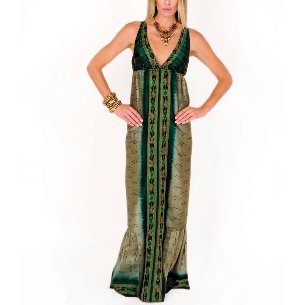 Dramatic bohemian maxi using one-of-a-kind antique silk sari. Beautiful on the beach or at dinner.