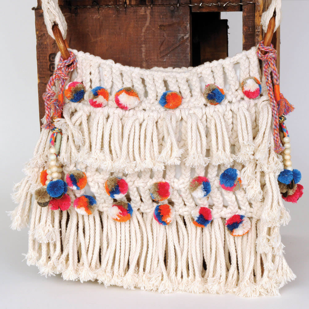 For the free spirited! Cotton fringe galore with whimsical pom poms. The side pom poms give a bit of jingle. You can't help but put a smile on your face when you wear this bag.