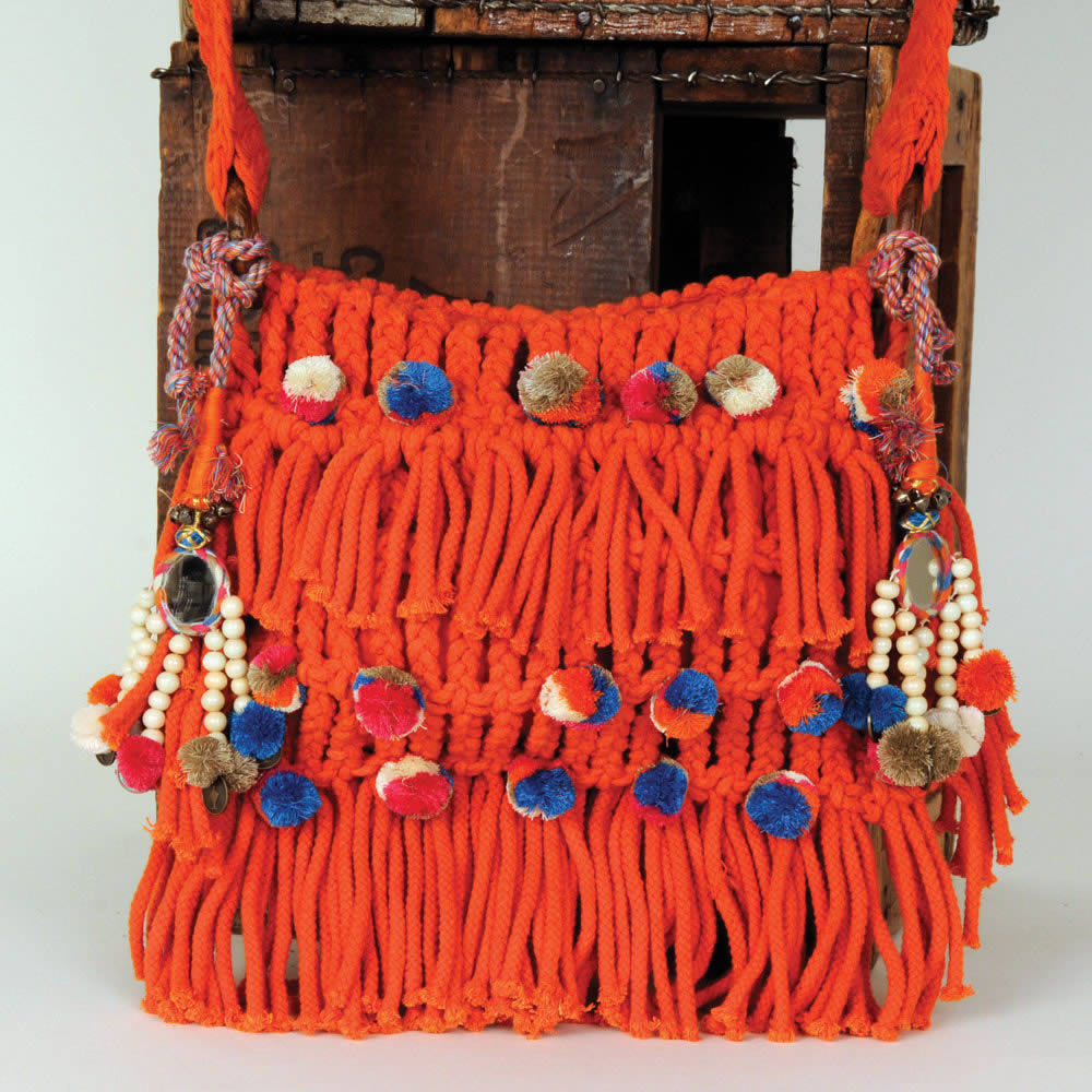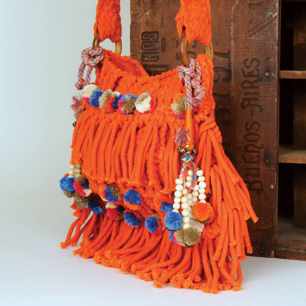 For the free spirited! Cotton fringe galore with whimsical pom poms. The side pom poms give a bit of jingle. You can't help but put a smile on your face when you wear this bag.