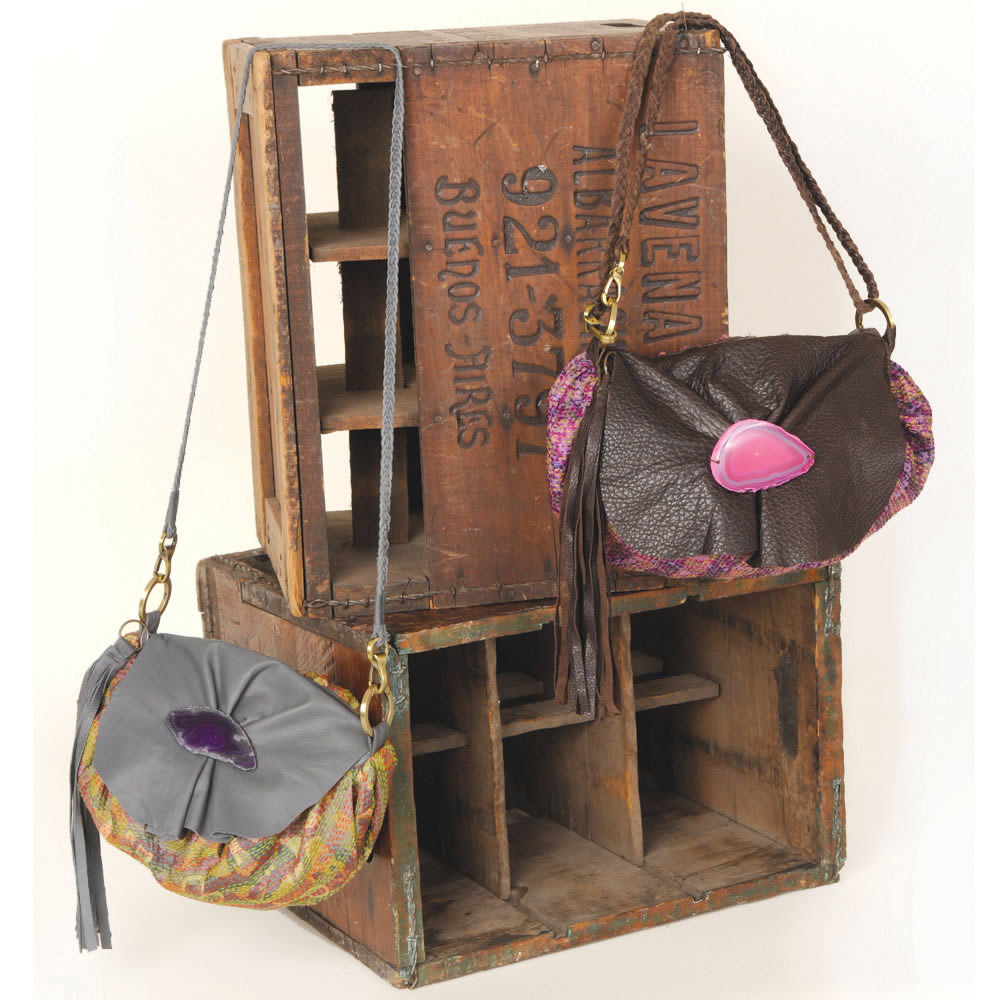 Unstructured, color rich silk kantha purse with buttery contrast leather flap, pinched with a slice of natural agate. Zipper closure. Adjustable braided shoulder strap can be worn across body or high under the arm.