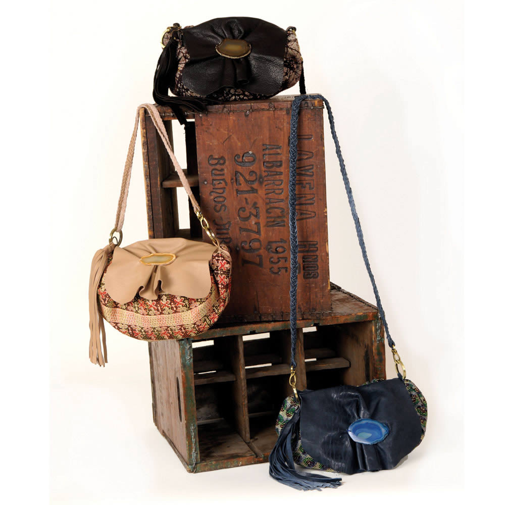Unstructured, color rich silk kantha purse with buttery contrast leather flap, pinched with a slice of natural agate. Zipper closure. Adjustable braided shoulder strap can be worn across body or high under the arm.