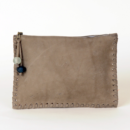 Grey leather clutch with whipstitching detail around edges.  African beads on zipper puller.
