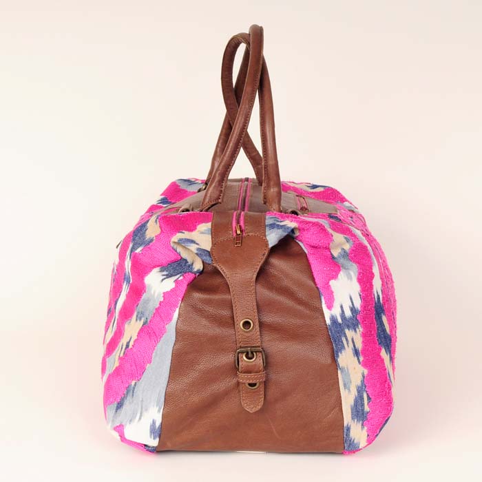 Not your typical carry-on! Flamboyant embroidery on tribal ikat print. Leather handles. Side leather belt straps adjust size. Crazy playful pompom zipper pull. Exterior zip pocket.