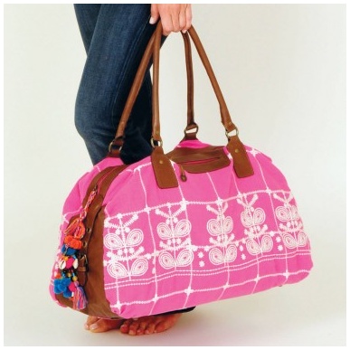 Not your typical carry-on! Pretty In Pink on White Embroidered Ikat. Leather handles. Side leather belt straps adjust size. Crazy playful pompom zipper pull. Exterior zip pocket.