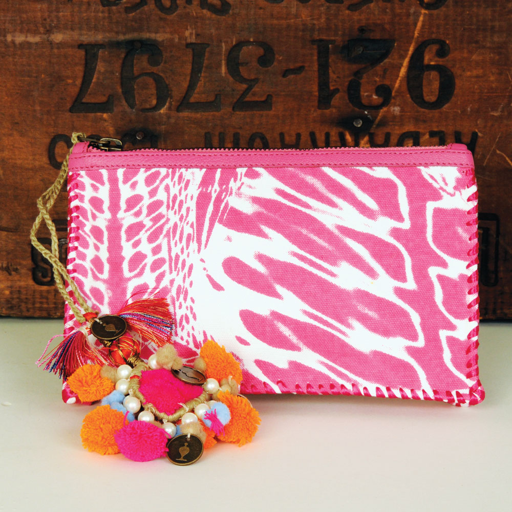 Wild print cotton canvas with zipper enclosure and contrast raffia whipstitching trim and whimsical pompom