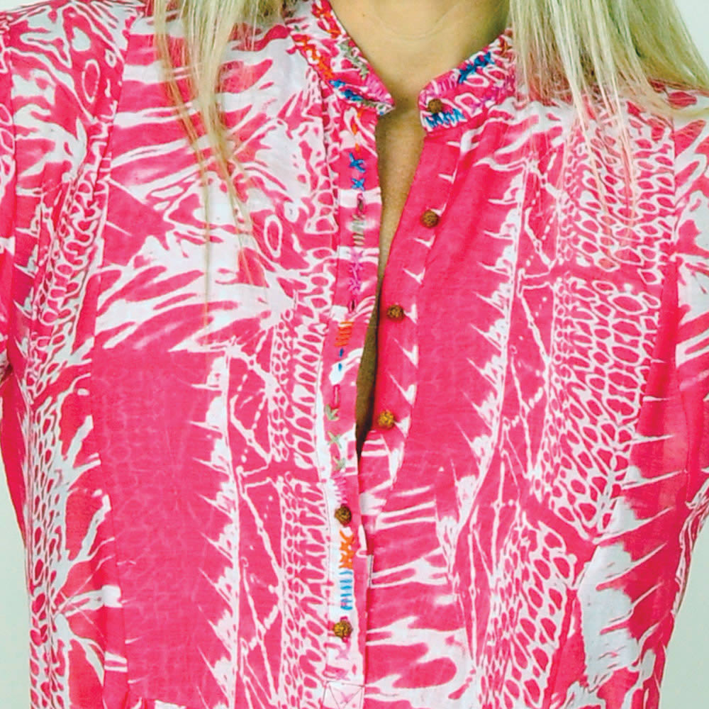 Wild printed gauzy cotton with accent embroidery on collar, and placket and cuffs. Wear over a bathing suit, jeans, gauze pants or as a casual dress. Toss the old boring cover up!