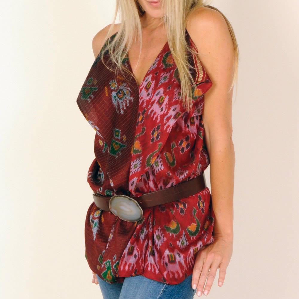 Lightweight, airy butterfly seamed design using one-of-a-kind hand-dyed saris. Wear loose and flowing or gathered under the bust with a fun broach. Cinch at the waist with a belt for a flattering silhouette.