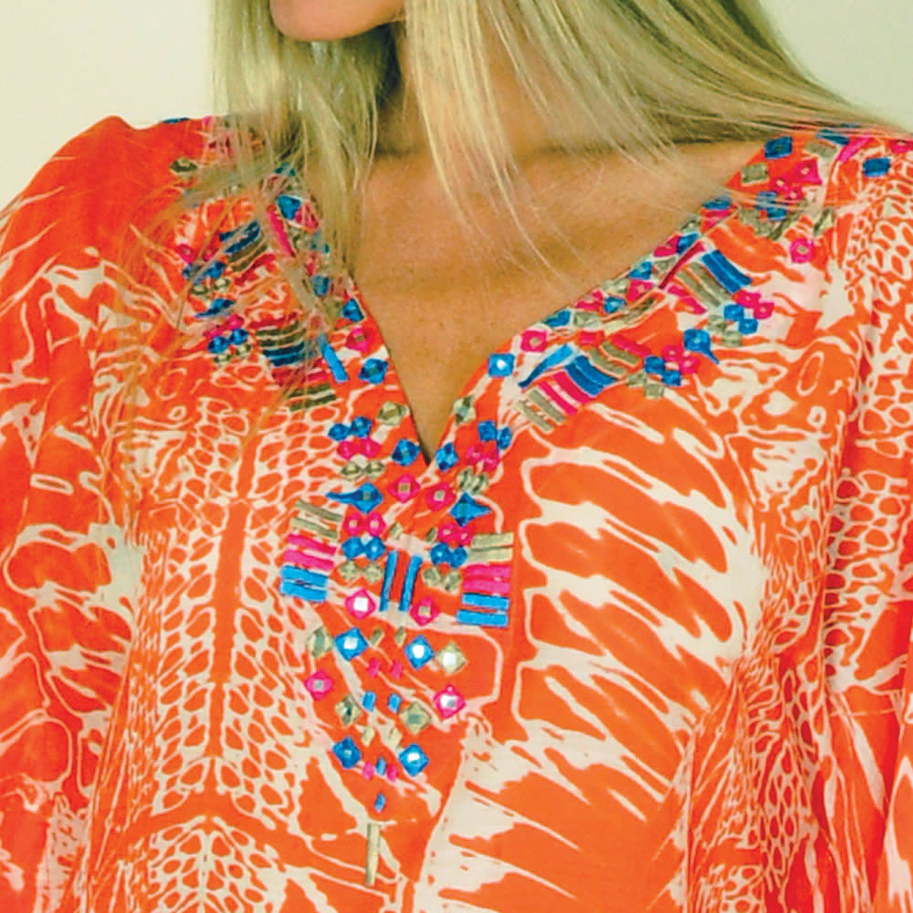 Wild printed cotton with embroidered arabesque neckline baring just enough décolletage. Wear over leggings, shorts, skinny jeans or swimsuit. Hidden seams create flattering silhouette.