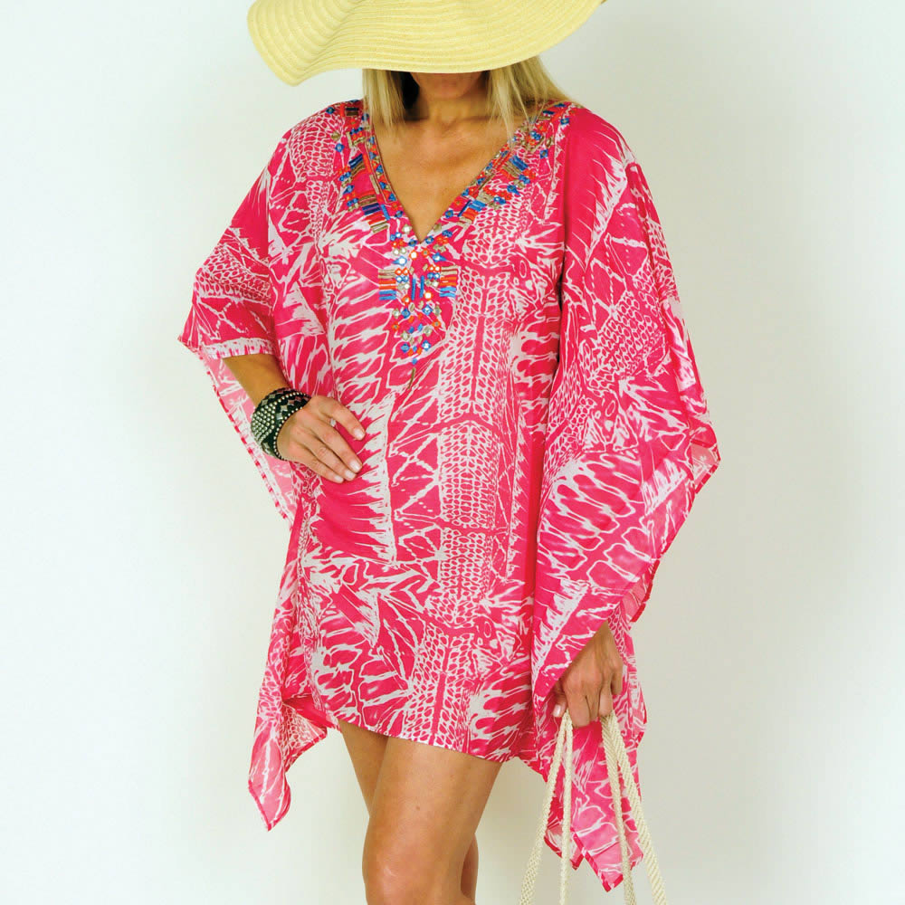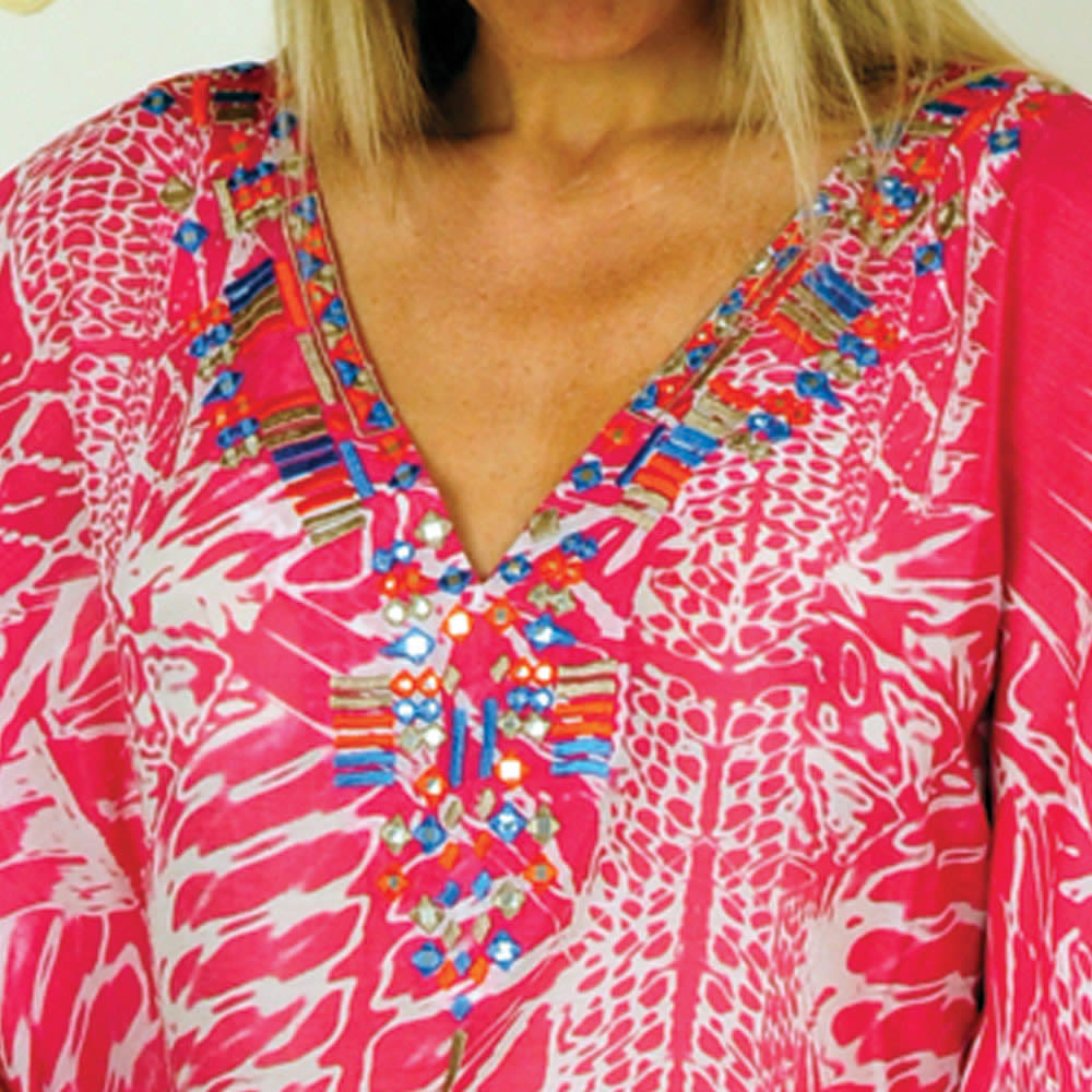 Wild printed cotton with embroidered arabesque neckline baring just enough décolletage. Wear over leggings, shorts, skinny jeans or swimsuit. Hidden seams create flattering silhouette.