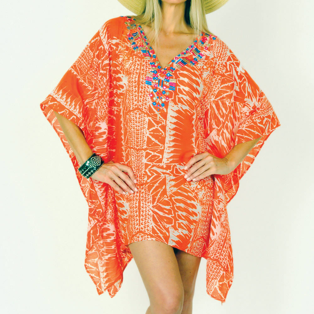 Wild printed cotton with embroidered arabesque neckline baring just enough décolletage. Wear over leggings, shorts, skinny jeans or swimsuit. Hidden seams create flattering silhouette.