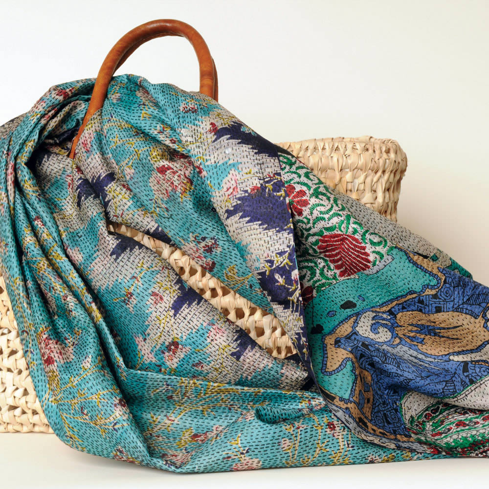 Hand stitched kantha shawls made of two layers of silk embroidered together