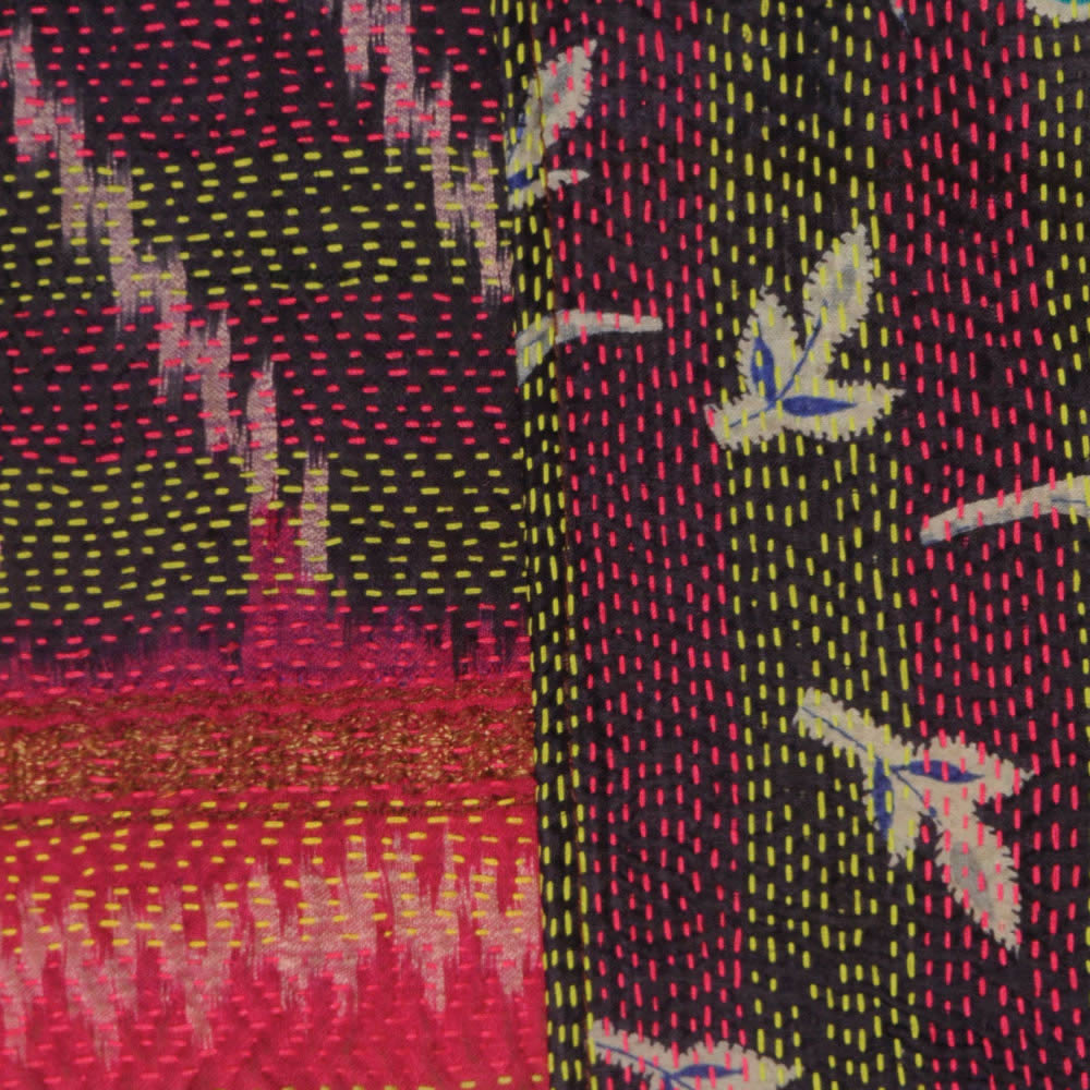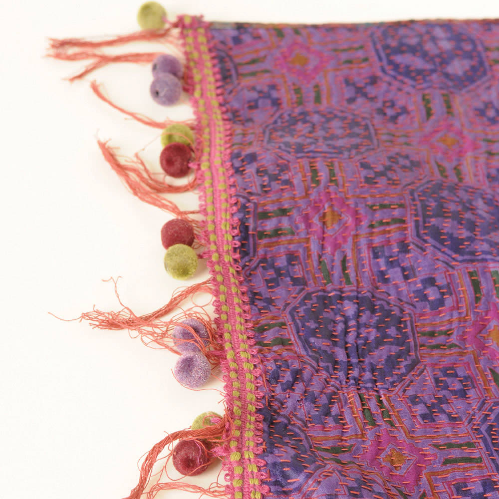 A thinner version of the hand stitched kantha shawls made of two layers of silk embroidered together. Decorative pompom trim.