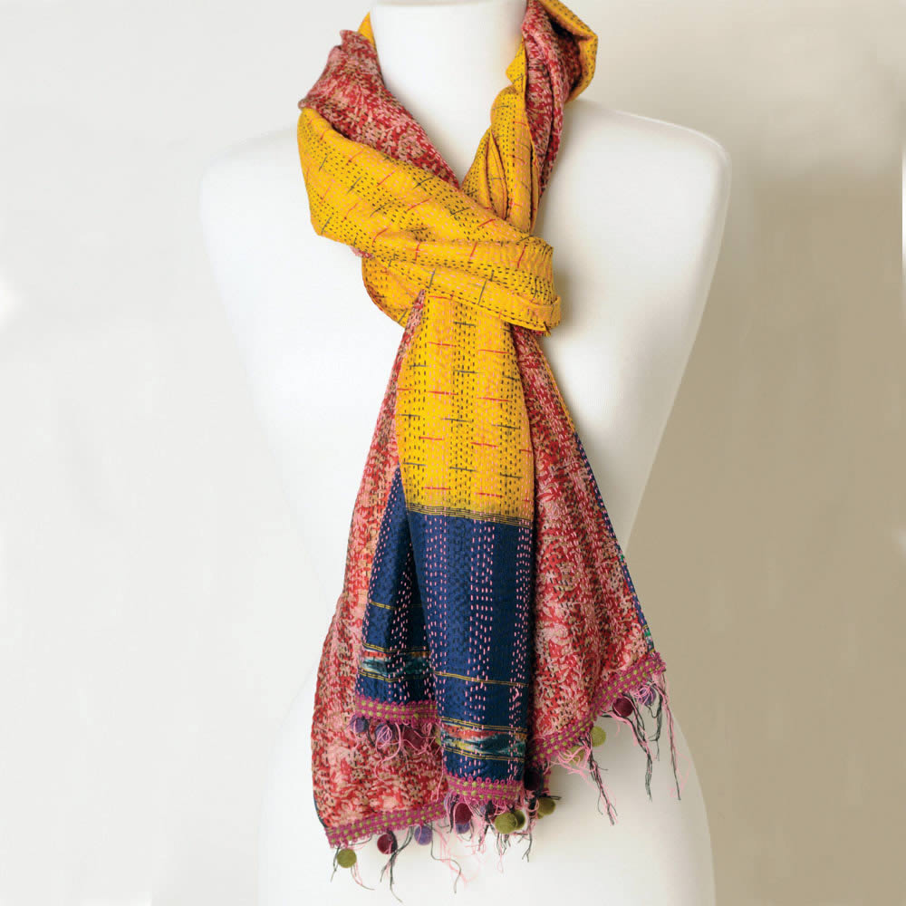 A thinner version of the hand stitched kantha shawls made of two layers of silk embroidered together. Decorative pompom trim.