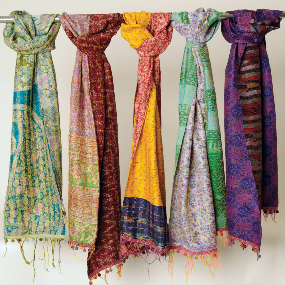 A thinner version of the hand stitched kantha shawls made of two layers of silk embroidered together. Decorative pompom trim.