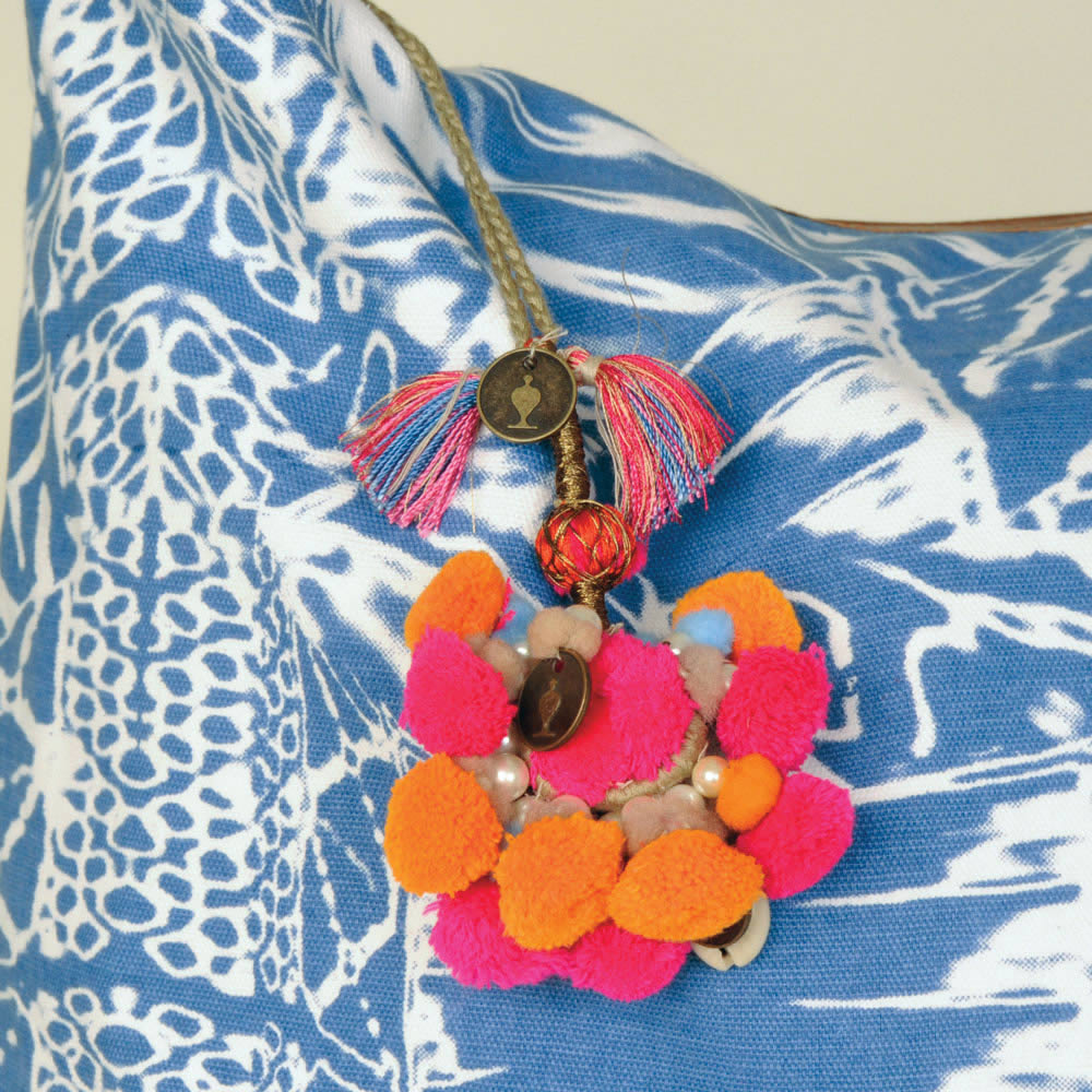 Don't be a slouch! Well, actually in this instance, ok! Hand braided leather handle with relaxed shaped hobo in bright tribal printed canvas and festive pompom zipper pull.