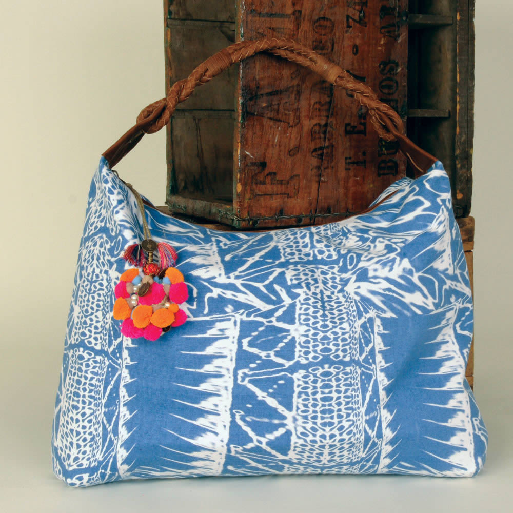 Don't be a slouch! Well, actually in this instance, ok! Hand braided leather handle with relaxed shaped hobo in bright tribal printed canvas and festive pompom zipper pull.