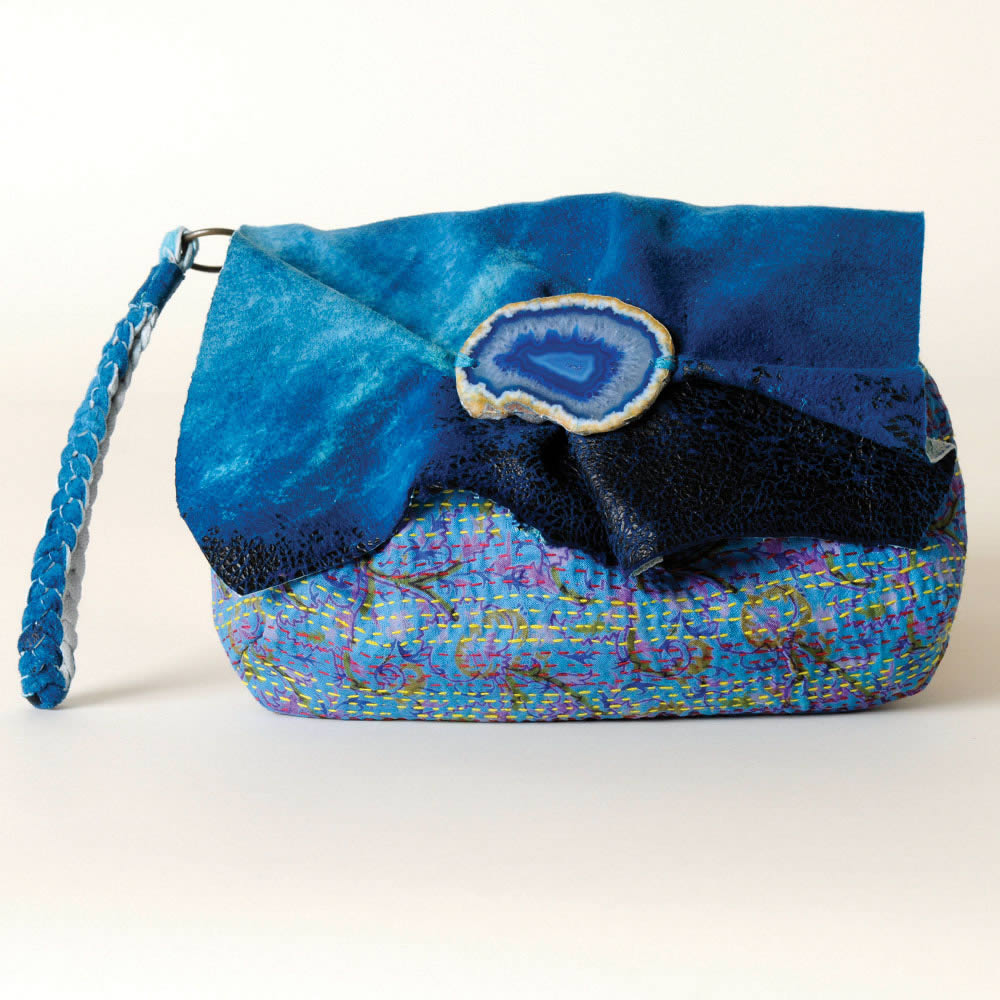 Color rich silk kantha with buttery contrast leather flap, pinched with a slice of natural agate. Zipper closure with braided wristlet strap.