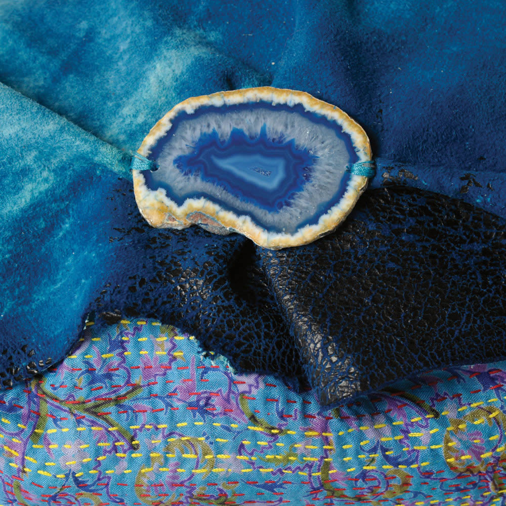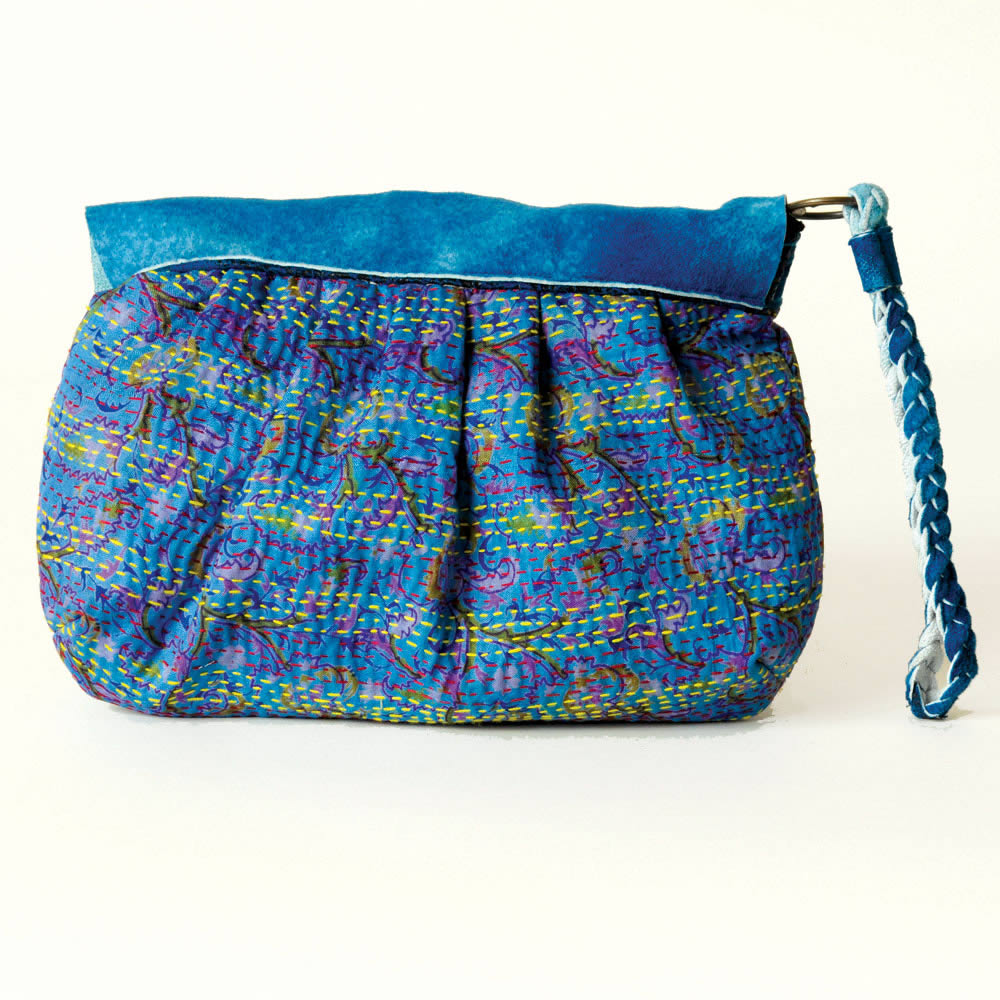 Color rich silk kantha with buttery contrast leather flap, pinched with a slice of natural agate. Zipper closure with braided wristlet strap.