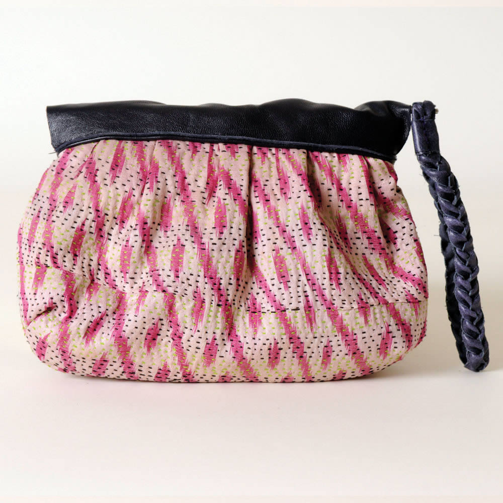 Color rich silk kantha with buttery contrast leather flap, pinched with a slice of natural agate. Zipper closure with braided wristlet strap.