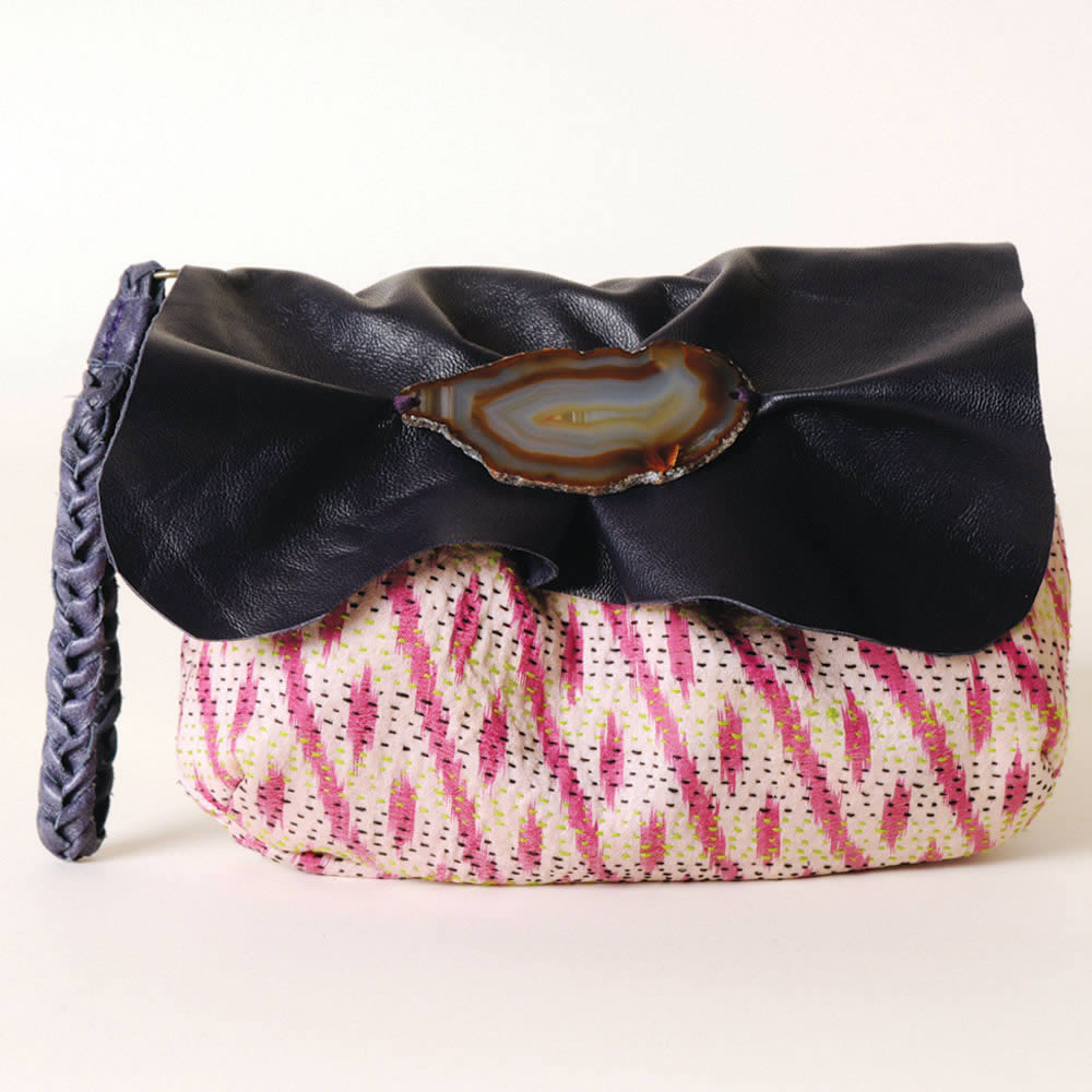 Color rich silk kantha with buttery contrast leather flap, pinched with a slice of natural agate. Zipper closure with braided wristlet strap.