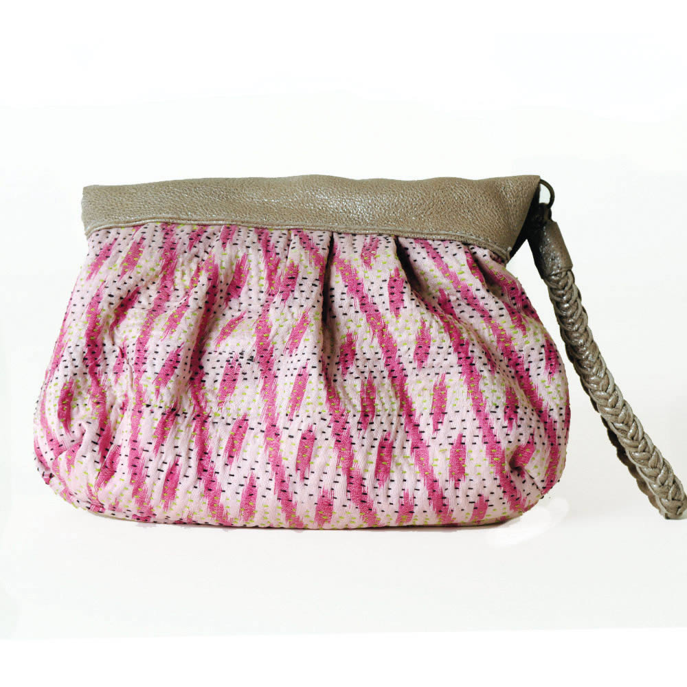 Color rich silk kantha with buttery contrast leather flap, pinched with a slice of natural agate. Zipper closure with braided wristlet strap.