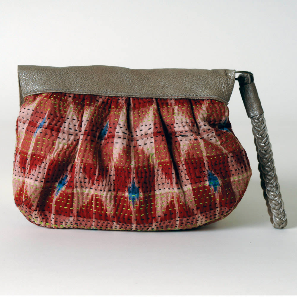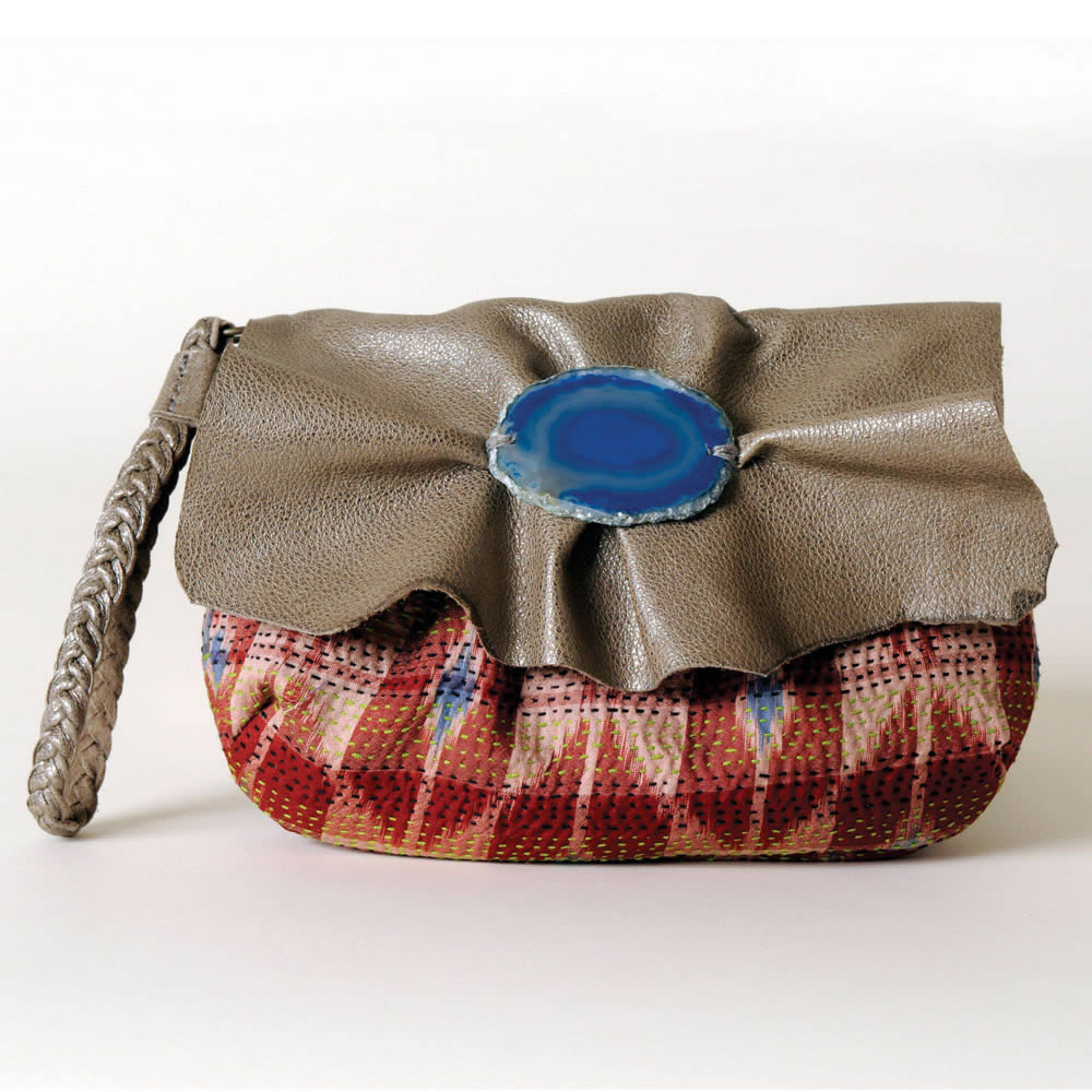 Color rich silk kantha with buttery contrast leather flap, pinched with a slice of natural agate. Zipper closure with braided wristlet strap.