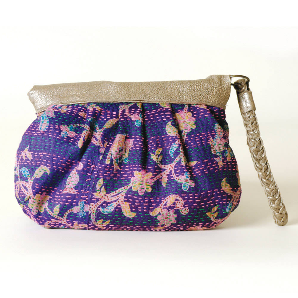 Color rich silk kantha with buttery contrast leather flap, pinched with a slice of natural agate. Zipper closure with braided wristlet strap.