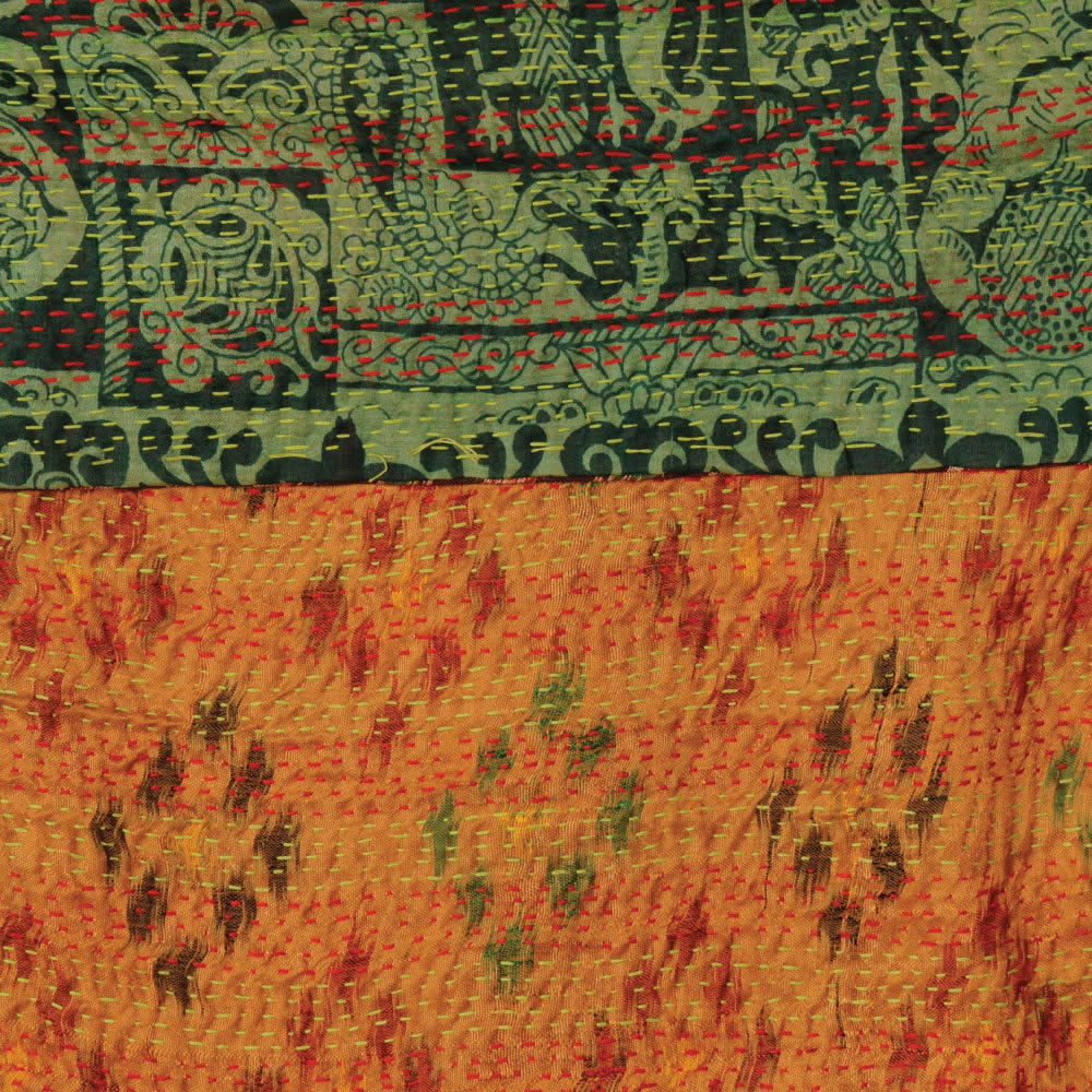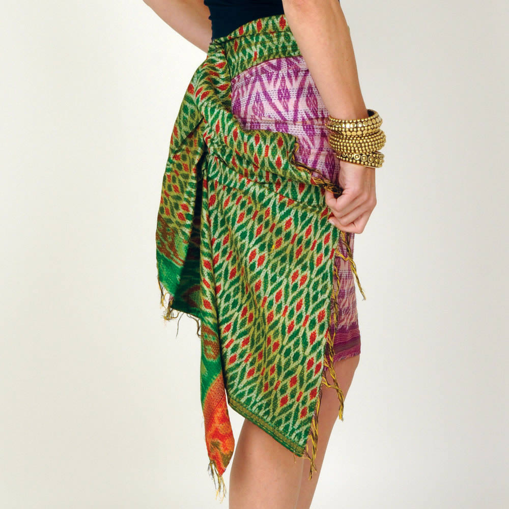 Eye-catching, body skimming skirt made of silk kantha fabric. Surprisingly flattering! Gathering and securing the fabric means the skirt can be transformed into differeing lengths, wear it high on waist or low on hips. Invisible side zipper. Wear the wagtail to the side or the back. Belt it to add interest.